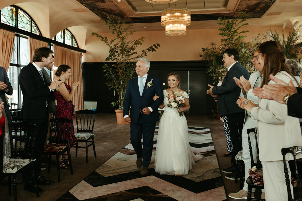 Het Zalmhuis is een droomlocatie voor stellen die houden van een combinatie van elegantie, licht en bijzondere details. De styling van deze bruiloft was modern, chic én een tikkeltje hippie — een unieke mix die perfect paste bij het karakter van het Zalmhuis. De grote ramen, het overvloedige daglicht en de prachtige stijlelementen maken het niet alleen een heerlijke plek om binnen te trouwen, maar ook om te fotograferen. Voor elke trouwfotograaf is dit een waar walhalla.