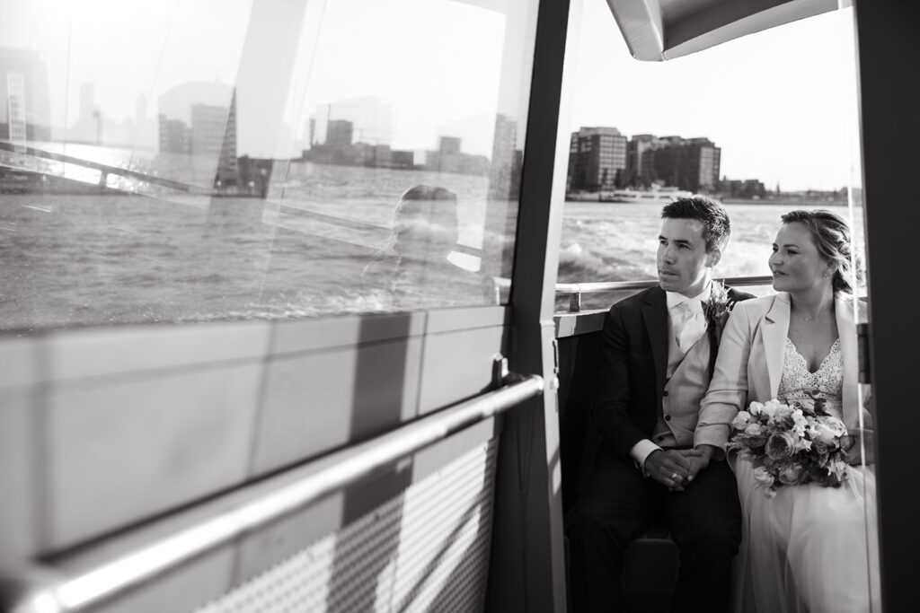 In de avond stond er nog een verrassing klaar: een ritje met de Watertaxi. En niet zomaar voor de fun, maar als spectaculaire entree voor de avondgasten! Rotterdamser wordt het niet. De foto’s op de Watertaxi waren geweldig – rauw, echt en vol beweging. Een droom om vast te leggen als trouwfotograaf.